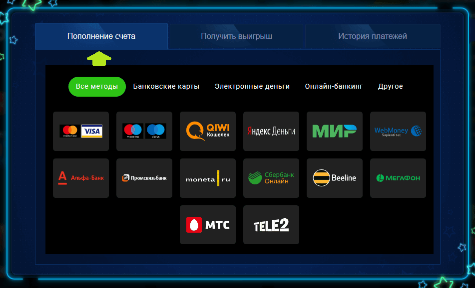 Минимальный депозит составляет 100 рублей, максимальный – от 15 до 50 тысяч рублей, в зависимости от платежной системы. Для депозита можно использовать карты Visa/Mastercard, QIWI, MTS, МегаФон, Yandex Money, Альфа-Банк, Билайн, BTC-кошелек, Ethereum-кошелек, Tele2, Perfect Money, Payeer. Чтобы осуществлять транзакции через СМС, нужно предварительно подтвердить телефон в личном кабинете.