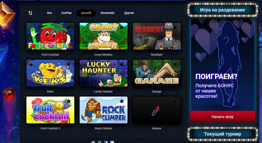 Но зато в отечественном онлайн-казино используются только русифицированные версии приложений, и каждая игра была проверена на наличие скриптов независимыми аудиторами. В основном на сайте встречаются приложения, разработанные компаниями Microgaming, NetEnt, Igrosoft, Novomatic.