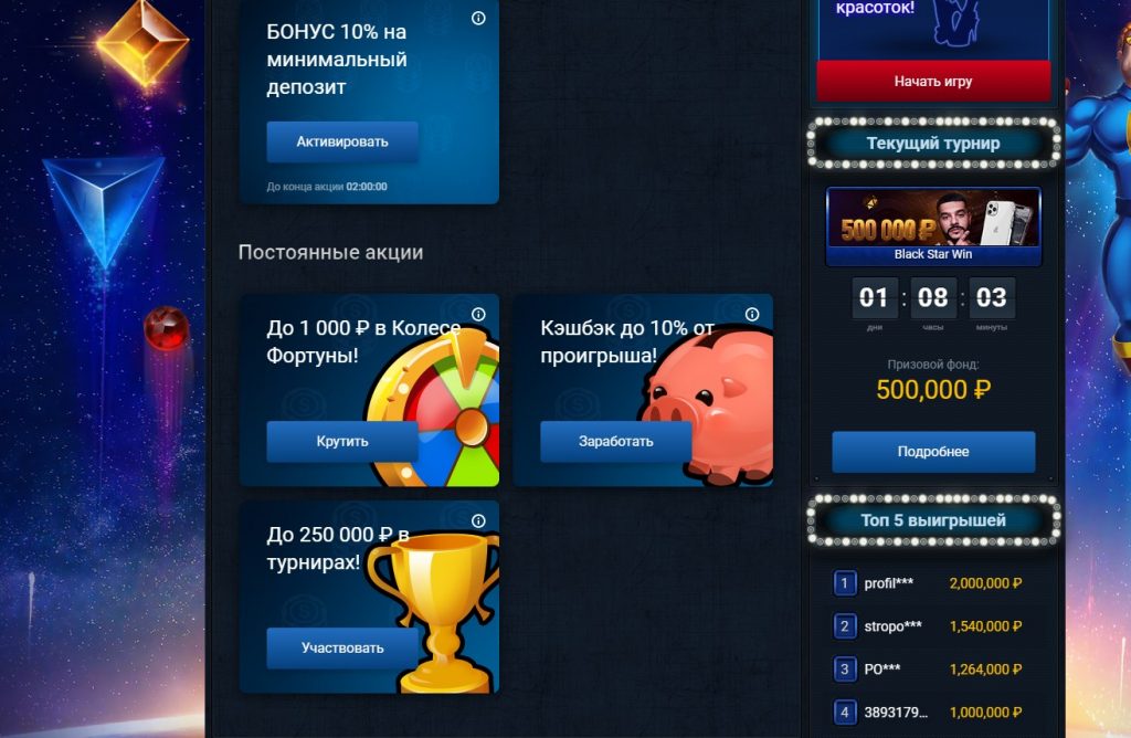 - Наличие накопительного джек-пота, турниров и лотерей.