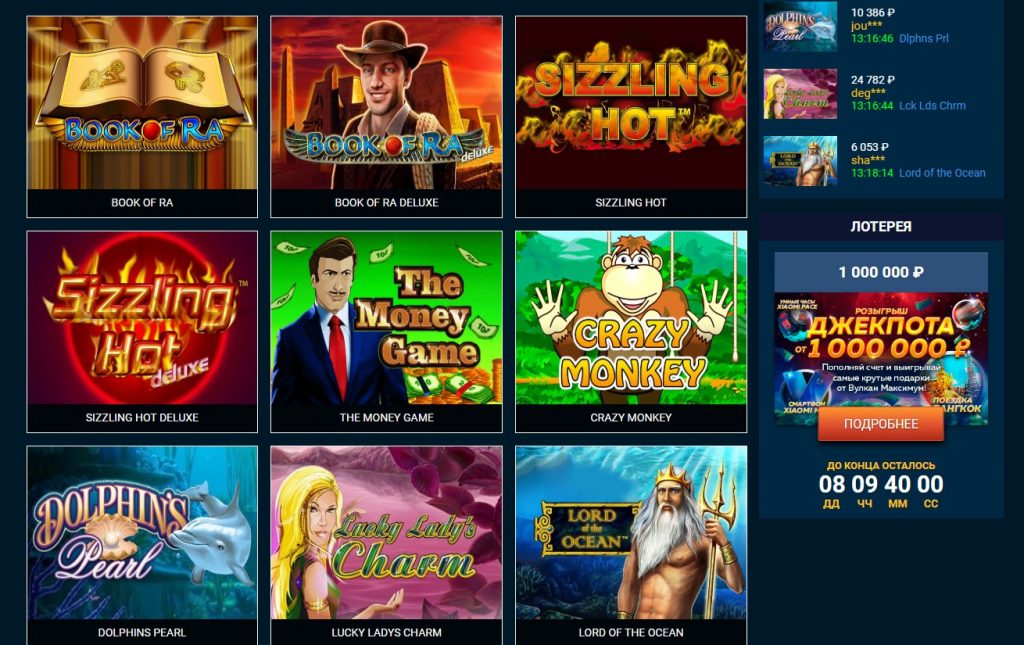 Официальный сайт портала выполнен в обычном стиле Вулкана. Главная страница классического стиля, фон – темно-синего окраса. На нем присутствует множество ярких иконок игровых аппаратов, вывески с акциями и бонусами для новых пользователей.