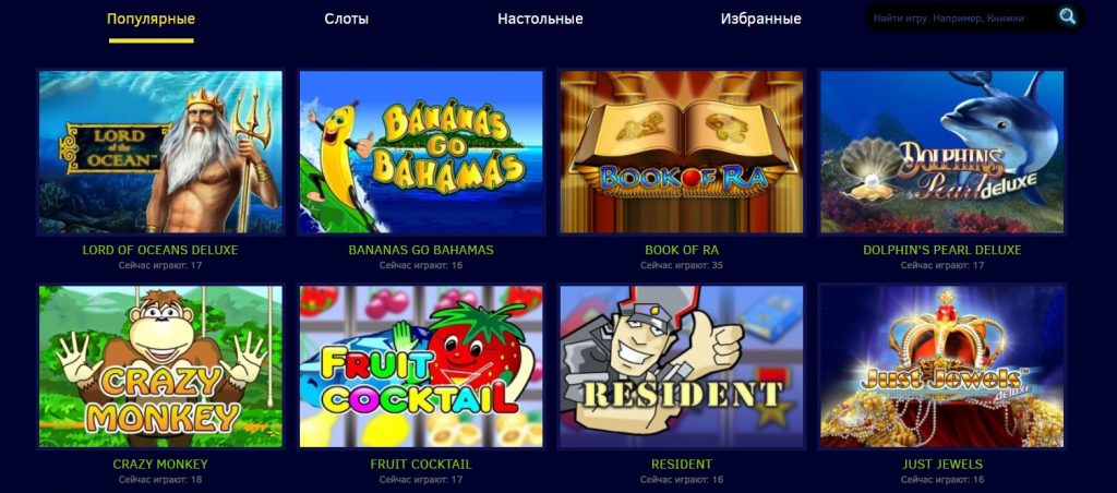 Среди самых популярных слотов стоит назвать: Золото Партии, Lucky Pirates, Операция Ы, Unicorn Magic, Ultra Hot Deluxe, Totem Island, Gorilla. К сожалению, сортировать игры по популярности, производителям или новизне нельзя. По этой же причине не получится найти модели с накопительным джекпотом, хотя они есть на портале.
