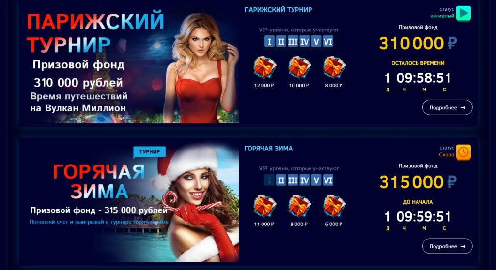 - Каждую неделю игроки с ВИП-статусом могут принимать участие в турнире «Как получить миллион?». Призовой фонд составляет 250 тысяч рублей. Также разыгрывают цифровую, аудио и видео технику, аксессуары, различные бездепозитные бонусы, общий размер которых доходит до 20 тысяч рублей.