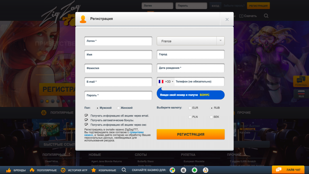 Чтобы играть на деньги в игорном клубе Зигзаг, нужно зарегистрироваться и пополнить депозит. Если при регистрации указать номер мобильного телефона, то можно дополнительно получить промокод, который принесет в дополнение к депозиту денежные средства в размере 50 рублей, которые можно использовать во время ставок. Благодаря этому шансы на победу увеличиваются.