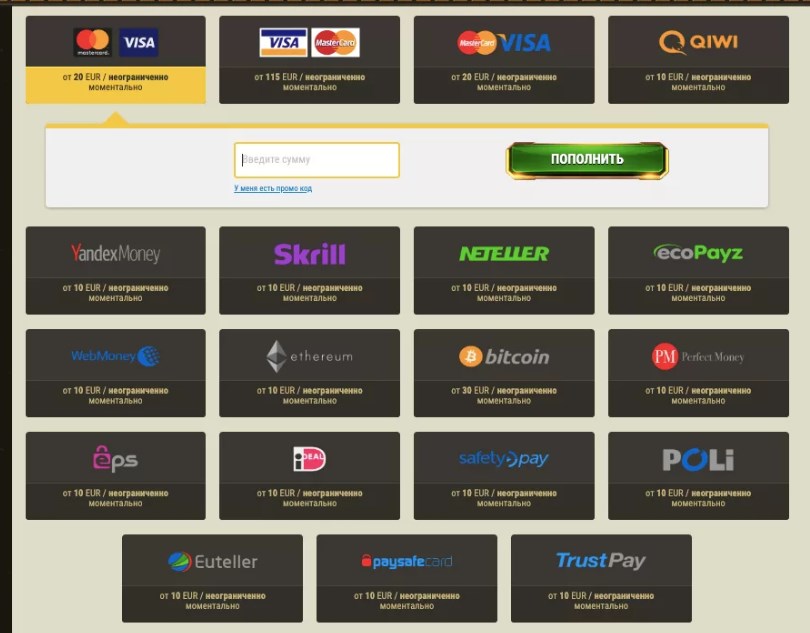 - Поддержка многих платежных методов. В европейских казино принимаются даже банковские переводы и можно расплачиваться криптовалютами. Также на порталах, которые ориентированы на жителей РФ, поддерживаются системы Альфа Клик, Сбербанк Онлайн, ВебМани, Киви и пр.