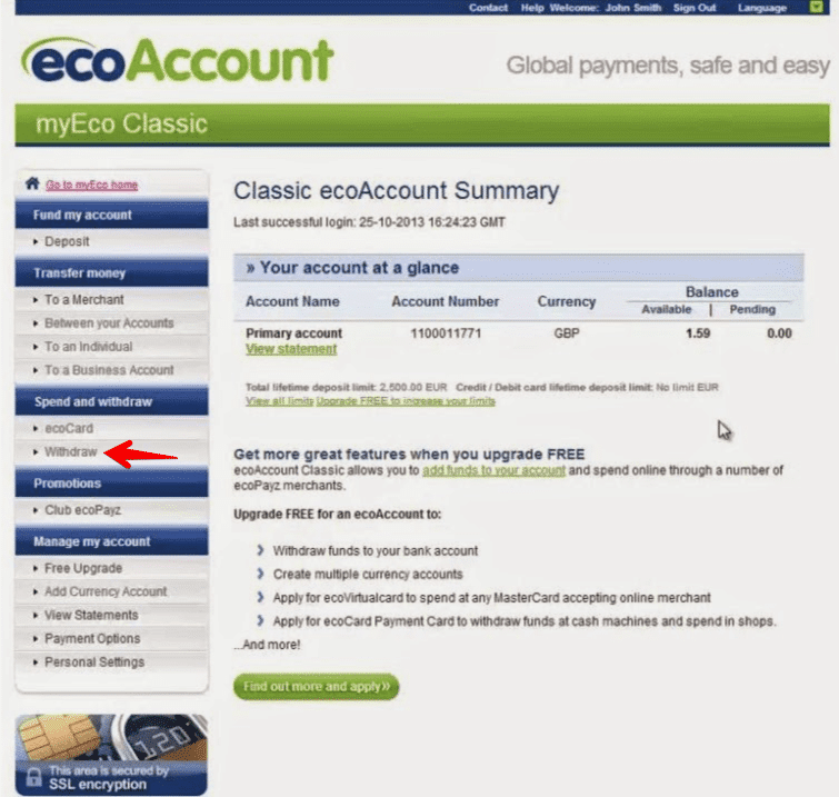 Во многих онлайн-казино можно не только пополнять счет через ЭкоПейз, но и можно выводить денежные средства через данную систему. Выдвигается лишь ряд требований. Во-первых, пополнять и выводить деньги нужно в одной и той же валюте и на один и тот же счет.