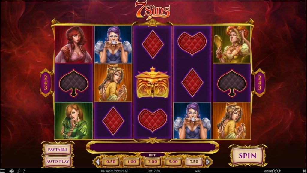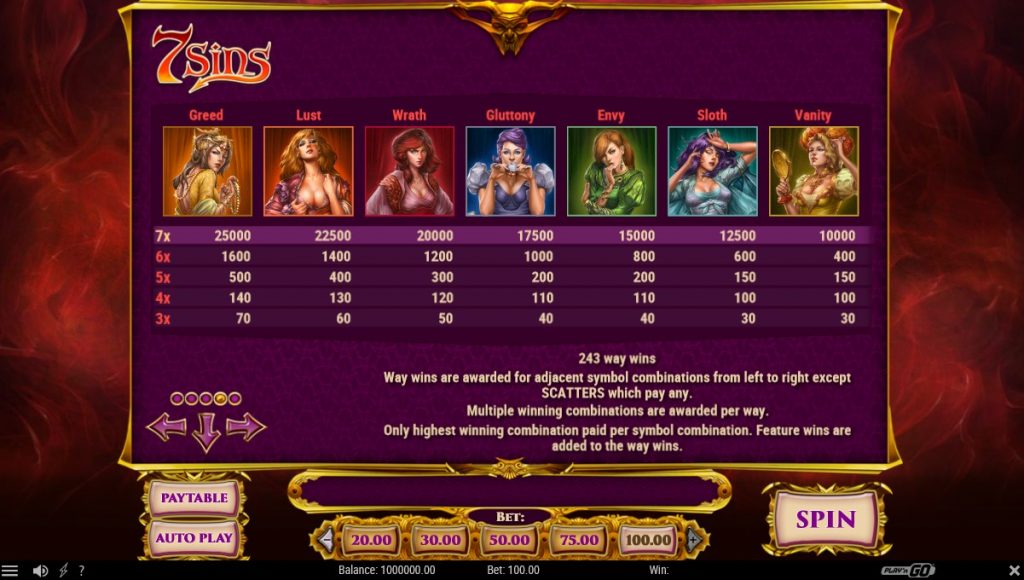 Игровой автомат 7 Sins – это традиционный слот с пятью барабанами. Общее количество комбинаций для выплат – 243. Они всегда активны, поэтому пользователь не может менять их количество. Аппарат рассчитан на автоматическое вращение, но в нем нет накопительного приза.