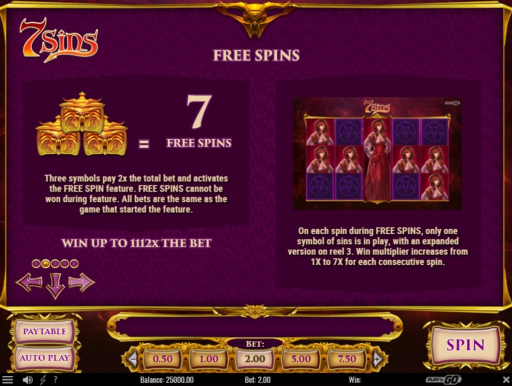Кроме тематической бонусной игры в слоте 7 Грехов предусмотрены бесплатные вращения. За выпадение трех ящиков Пандоры клиенту дают 7 фриспинов. В этих вращениях участвуют только пиктограммы с грехами. Они могут расширяться на всю длину барабана и появляться повторно на других катушках. Призовые совпадения оплачивают с множителями от х1 до х7 в зависимости от порядкового номера бонусного вращения.