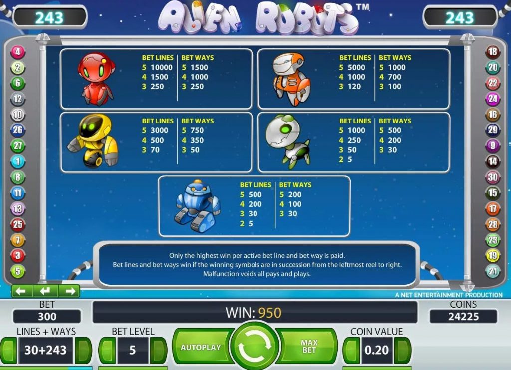 Другие названия аппарата – Инопланетные пришельцы, Роботы-пришельцы. Выигрыш возможен по 30 или же 243 активным линиям. То есть в игре два режима, можно выбрать самостоятельно.