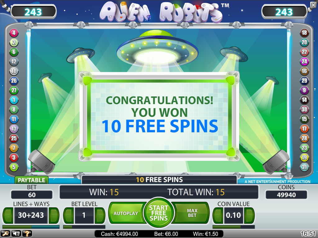 Например, когда во время серии фриспинов выпадает еще 5 зеленых инопланетных тарелок, пользователь получает дополнительно 50 бесплатных вращений.