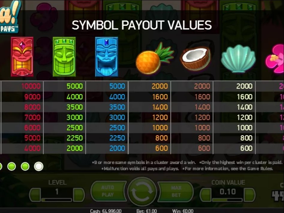 Симулятор Aloha: Cluster Pays разработал известный провайдер игрового софта – компания Net Entertainment. Здесь нет привычных для игроков линий. Для начисления выигрышных комбинаций используют последовательности символов, расположенных по вертикали и горизонтали. При этом комбинации, совпавшие по диагонали, не учитываются.
