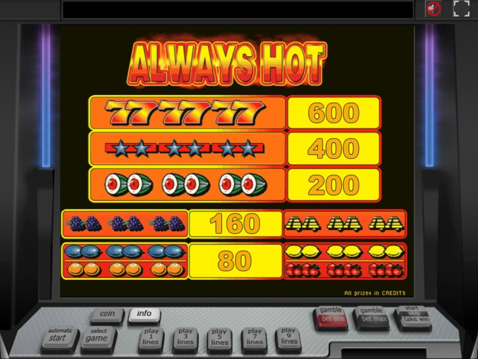 Еще одно детище популярной компании Novomatic – игровой аппарат Always Hot. Внешне слот похож на традиционные машины, стоящие в наземных азартных клубах. Однако классическая цифровая версия автомата понравилась гемблерам не меньше.