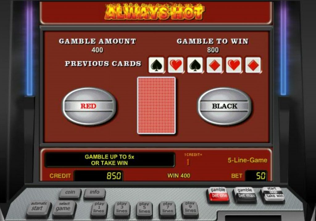 Рисковая игра в слоте Всегда горячий – это единственный способ преумножить свой выигрыш после успешного спина. После любого результативного вращения барабана игрок может нажать кнопку «Gamble», чтобы активировать турнир на удвоение.