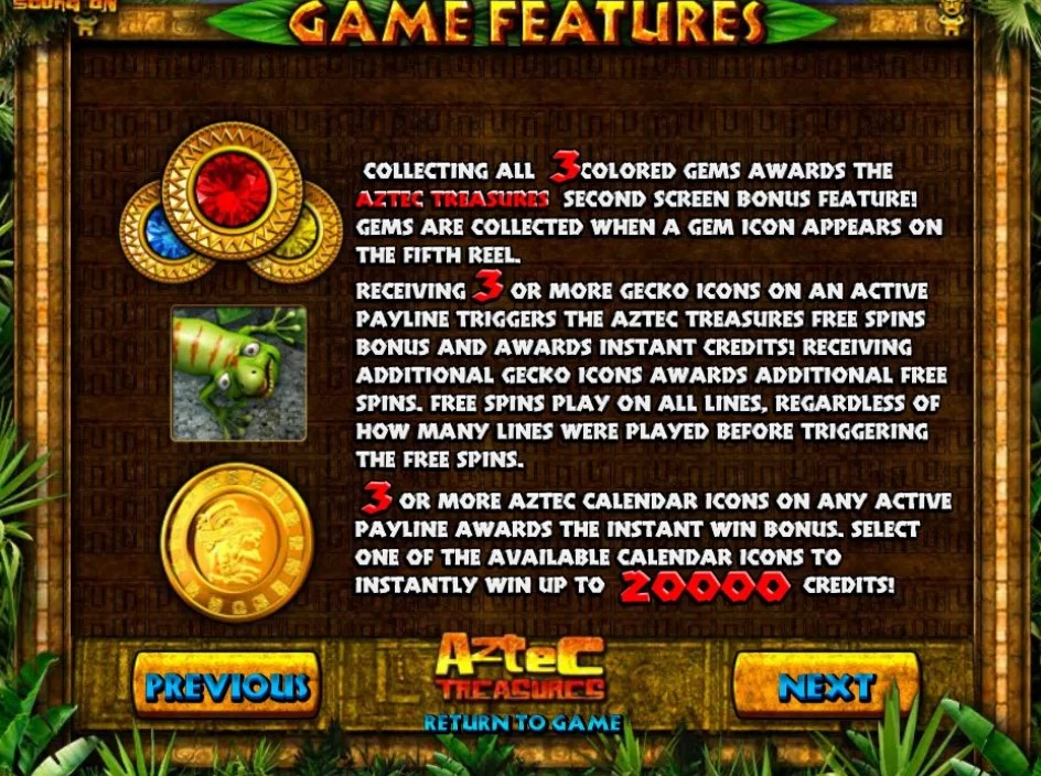 Производителем увлекательной игровой машины Aztec Treasures является известная в мире гемблинга компания Бетсофт. Гемблер должен отыскать сокровища ацтеков, чтобы разбогатеть.
