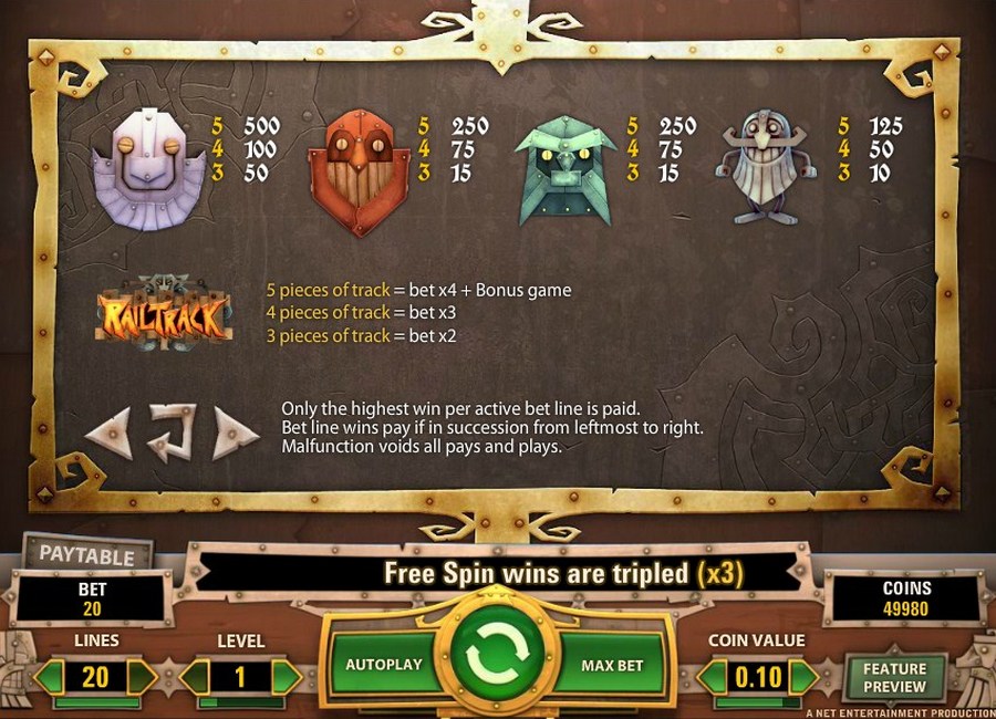 В игре Boom Brothers есть бонусный элемент – это картинка с надписью Railtrack. Он активирует отдельную бонусную игру. Вайлдом, который подменяет недостающие пиктограммы, является изображение бомбы с надписью «Вайлд». Дикий символ не заменяет только скаттер. Сам дикий элемент при повторении от двух штук приносит вознаграждение в размере 5-7500 монет.