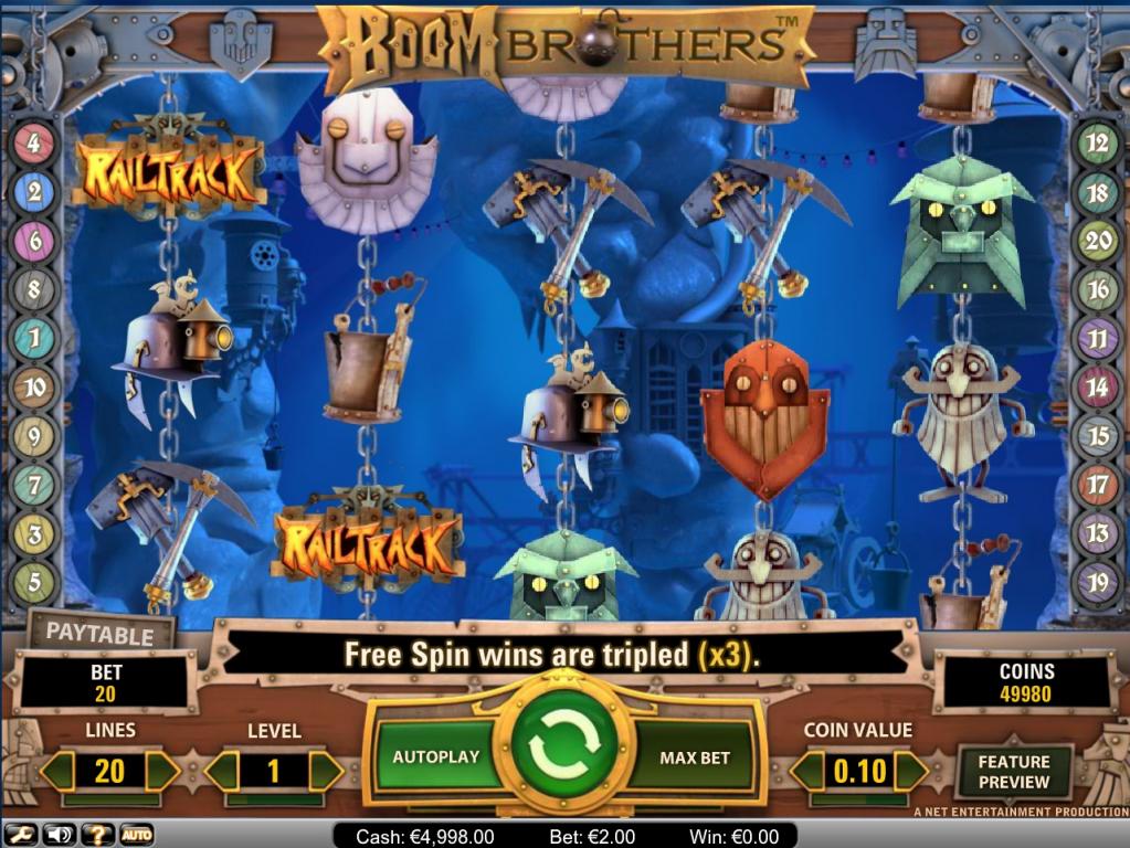 Игровой автомат Boom Brothers имеет пять барабанов и 20 игровых полос. Игрок может сам выбирать количество активных линий. Симулятор можно запускать в автоматическом режиме, но в нем не предусмотрен накопительный призовой фонд.