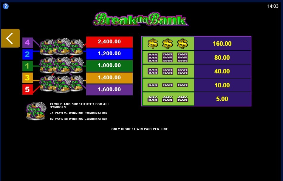 Символов, приносящих денежные вознаграждения в игровом автомате Break da Bank slot machine, не так уж и много. Функции дикого символа возложены на пиктограмму с изображением золотых монет и названием игры. При выпадении трех вайлдов на одной активной полосе игрок гарантировано получит от 1000 до 2400 тысяч монет. Наибольшее вознаграждение в игре предусмотрено за пять пиктограмм с диким символом.