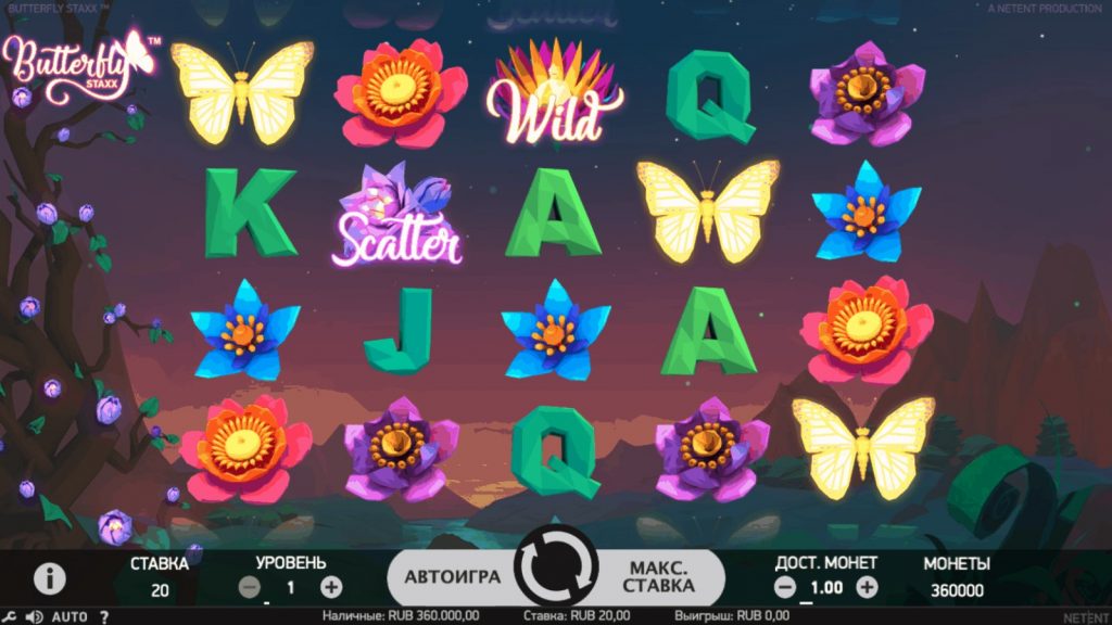 Другое название популярного слота – Бабочки. Игровой автомат разработан известной компанией Нетент, у которой безупречная репутация относительно софта. Butterfly Staxx – это простая и интуитивно понятная игра, имеющая сюжетные переплетения, высококачественную графику, потрясающее звуковое и визуальное сопровождение.