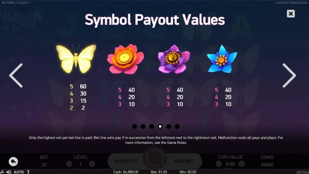 Частота выпадения бонуса – каждые 100-250 спинов. Иногда автомат выдает серии бонусных игр, когда через каждые 5-10 спинов выпадают три и более Скаттеров. Средний выигрыш с бонуса в размере 43%. Волантильность средняя, как и длительность цикла. Линии в аппарате Butterfly Staxx постоянно активны, изменить по своему желанию нельзя. Можно только варьировать номинал монет и размер ставки.