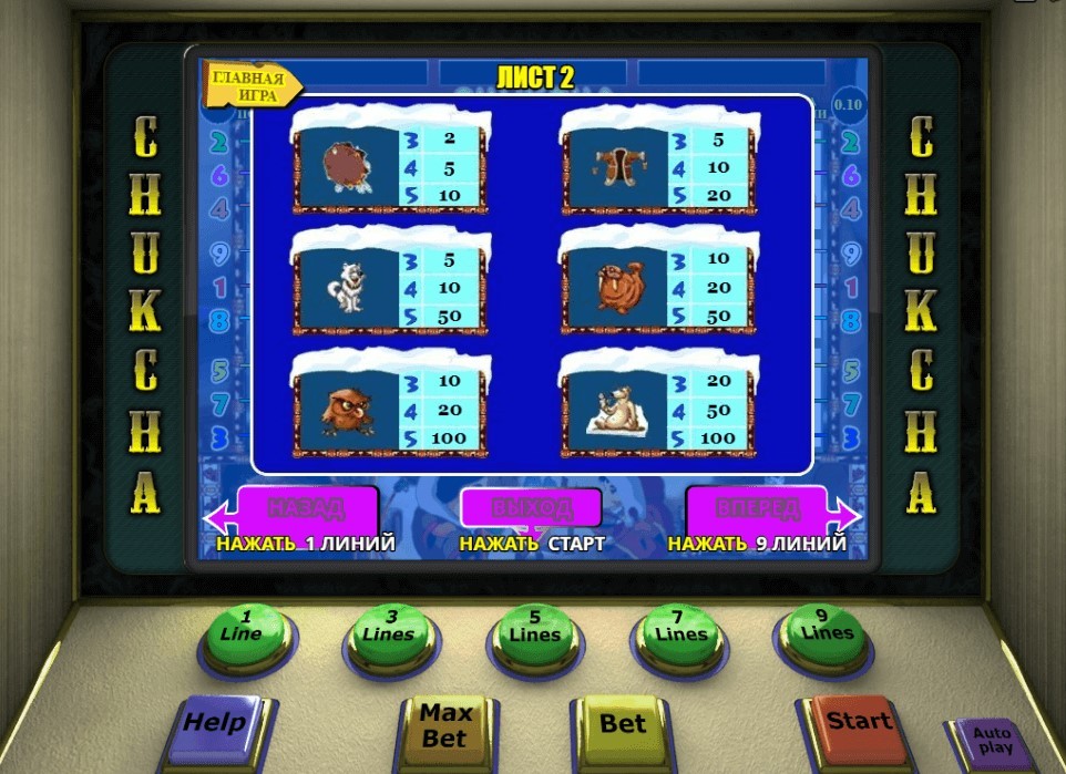 Игровой автомат Chukcha – это традиционный видеослот с пятью барабанами и девятью активными линиями. Игрок может активировать 1, 3, 5, 7 или 9 полос. Игровая модель не рассчитана на прогрессивный или фиксированный призовой фонд. Игрок может запускать слот в автоматическом режиме.