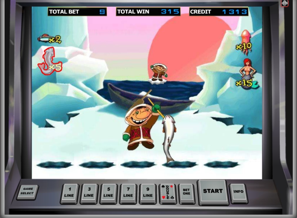 Второй бонусный турнир запускается, когда на игровом поле выпадет три и более пиктограммы с чукчей. Этот раунд проходит на отдельном экране. Задача клиента – выловить как можно большее вознаграждение из проруби. За сома, кальмара, русалку и морскую рыбу дают приз в размере 2-25 монет. Если из проруби удастся достать тамбурин, то гемблер окажется в пещере, где за одной из двух статуй находится вознаграждение.