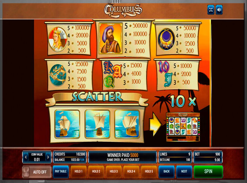 Игровой автомат Колумб – это слот с пятью барабанами и девятью линиями для выплат. В игре не предусмотрен прогрессивный джекпот, зато есть скаттер и дикий символ, который увеличивает шансы на получение комбинации с высокими процентами выплат.