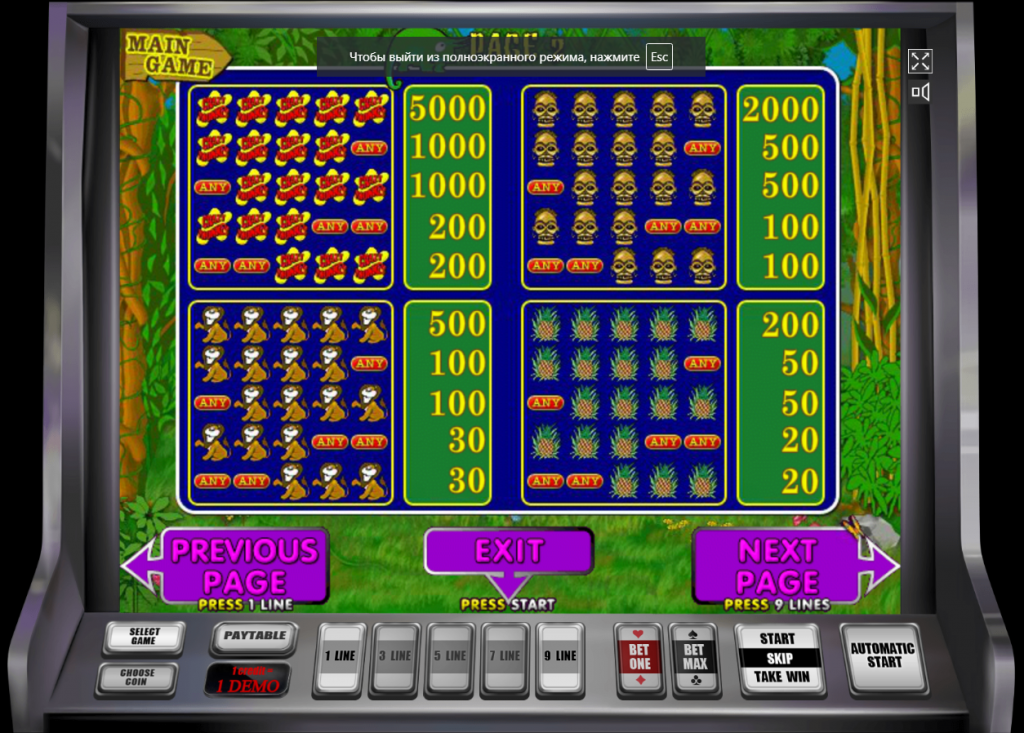 Поскольку этот аппарат создавался во времена, когда азартные игорные клубы были новинкой, его постарались сделать максимально простым и понятным. На игровом поле, напоминающем джунгли, расположены барабаны и кнопки управления.