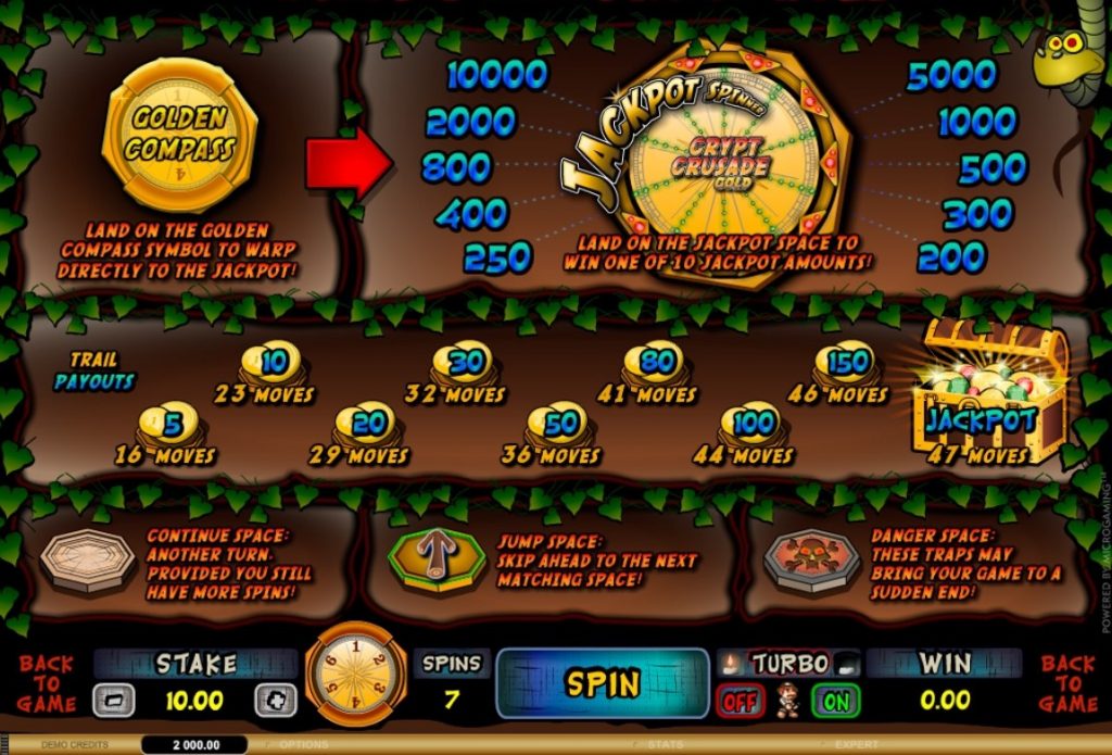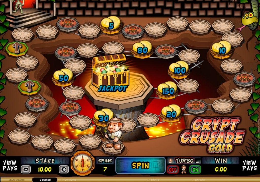 Также в игре Crypt Crusade Gold есть ячейки с изображением черепа и костей. Если главный герой попадает на них, то гибнет, а игра прекращается. Причем последняя выигранная сумма зачисляется на счет клиента.