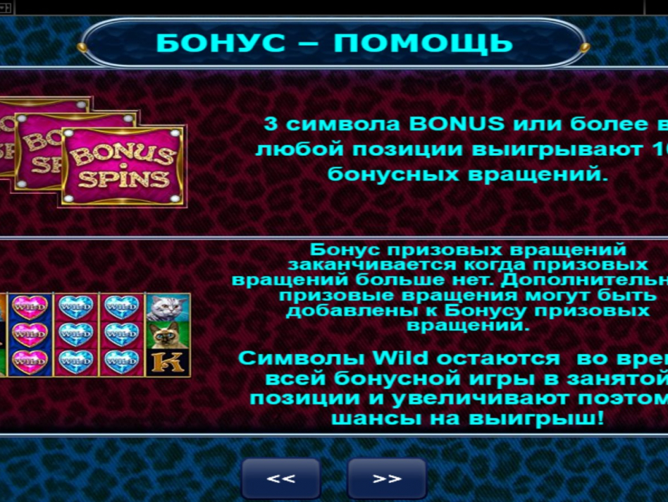 Вместо тематической бонусной игры в слоте Diamond Cats предусмотрены фриспины с особыми функциями. После выдачи минимум трех скаттеров посетитель получает 10 бонусных кручений, во время которых дикий элемент остается в ячейках, где он выпад, до окончания бесплатных спинов. Поэтому чем больше вайлдов выпадает, тем больше шансов на составление призовой последовательности получит игрок. Повторное выпадение скаттеров добавляет еще 10 бесплатных кручений.
