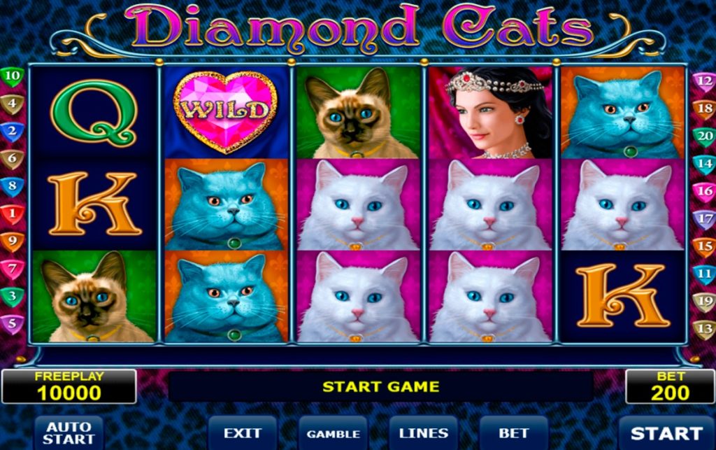 Игровой автомат Diamond Cats (Бриллиантовые кошки) выпустила на рынок гемблинга компания Аматик. Любители пушистых зверей будут просто в восторге, потому что призовые комбинации на пяти барабанах составляют эти красивые животные. Высокий процент отдачи и бесплатные вращения с замерзающим вайлдом относят к числу преимуществ симулятора.