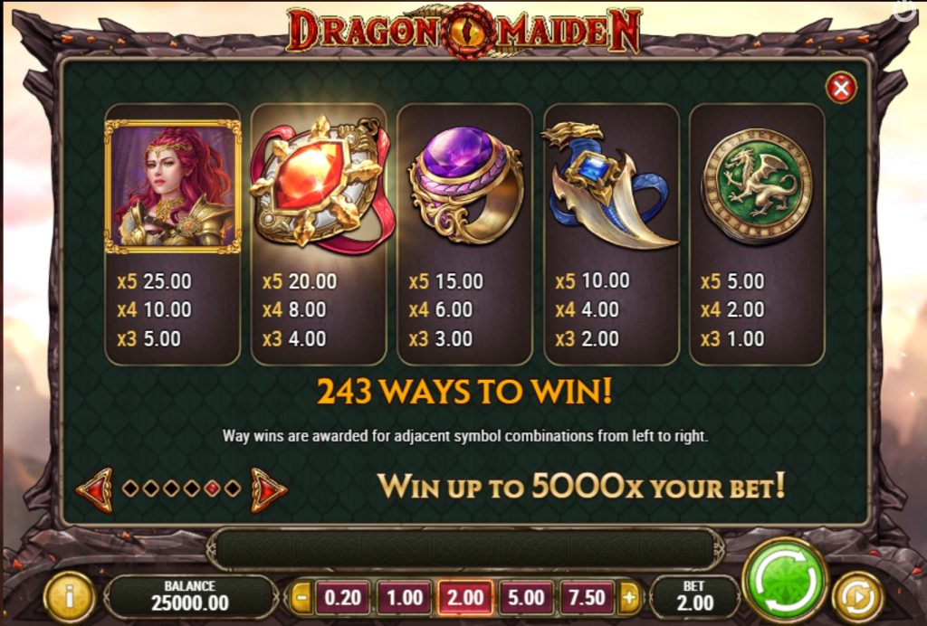 Игровой автомат Dragon Maiden имеет пять барабанов. Они формируют три ряда символов. Всего в игре предусмотрено 243 призовые полосы. Их количество менять нельзя, потому что они всегда активные. В бонусной игре количество линий для выплат увеличивается до 7776, есть повторные спины и спецсимволы.