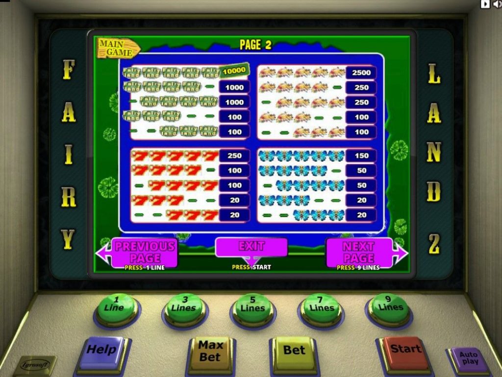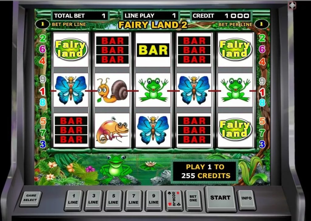 Есть у игрового аппарата Fairy Land 2 и другие названия – Сказочная страна 2 и Лягушка. Игровое поле оформлено в зеленом цвете и похоже на болото. Кнопки управления вынесены в нижнюю часть экрана. Все информационные табло расположены над главной панелью.
