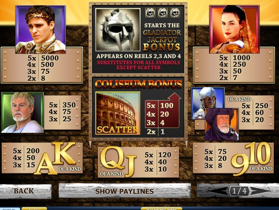 В качестве «разброс» символа в игре Гладиатор использовано изображение Колизея. При выпадении 3-5 картинок в любой части игрового поля активируется вторая призовая игра.