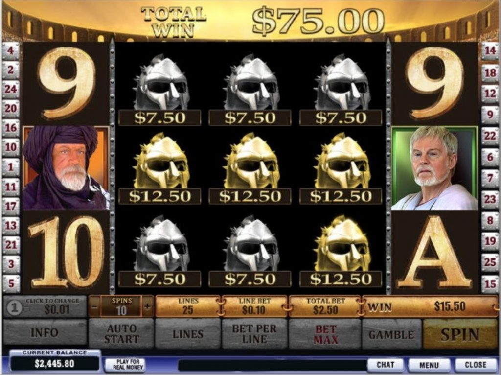 Видеослот Gladiator имеет пять барабанов и 25 линий для ставок. В игре предусмотрен накопительный джекпот, функция автоматического вращения барабанов и бесплатные спины. Также игроки могут повысить свои шансы на победу в рисковой и бонусной игре.