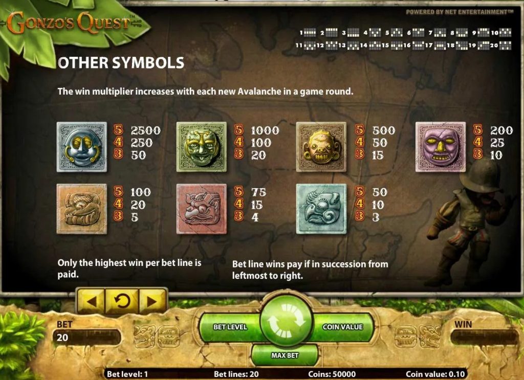 Слот Gonzos Quest – это классический игровой аппарат с пятью катушками и 20-ю игровыми линиями. Клиенты активируют любое количество полос от 1 до 20. Слот можно запускать в автоматическом режиме. В нем нет накопительного приза или фиксированного джекпота.