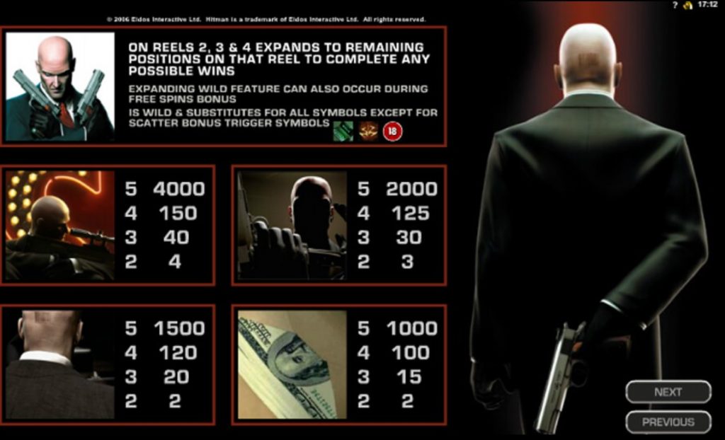 Игровой автомат Hitman является классической пятибарабанной машиной с 15 активными линиями. В игре не предусмотрен прогрессивный джекпот, но есть бесплатные вращения и дополнительные бонус-символы. В слоте заложены две бонусные игры, которые автоматически активируются после выпадения трех спецсимволов.