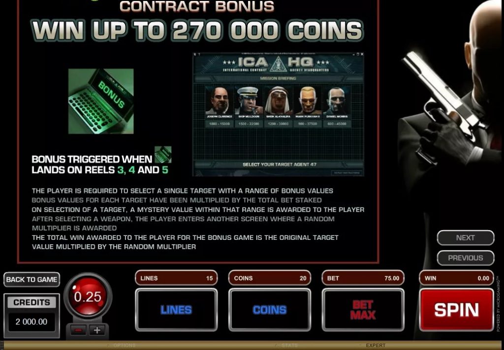 В первой бонусной игре «Insignia Bonus» нужно выбрать одну из предложенных пиктограмм. При этом у игрока есть шанс заработать 6 тысяч монет. Второй бонусный турнир называется «Contract Bonus». Здесь гемблер выполняет опасное задание. Ему нужно выбрать оружие и жертву. От его выбора зависит коэффициент умножения. При удачном раскладе он может заполучить до 270 тысяч монет.