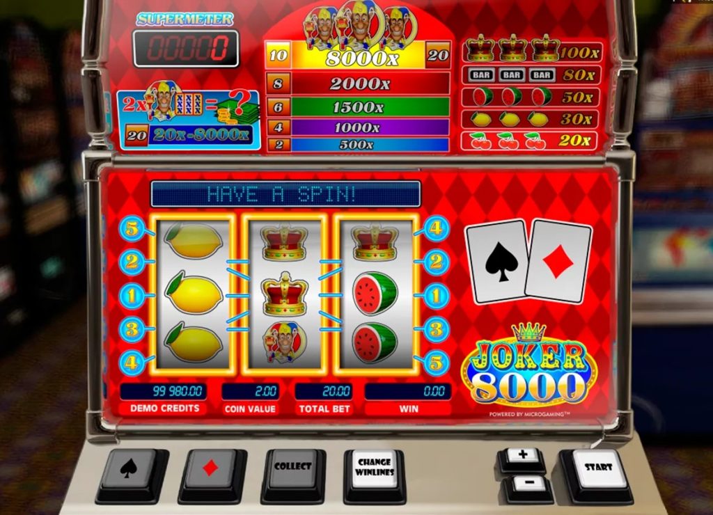В игровой аппарат Joker 8000 можно играть бесплатно. Для этого активируют демо-версию игры. Такая возможно есть у всех посетителей казино, независимо от прохождения регистрации. Неважно также наличие денег на депозите, потому что игра ведется на виртуальные монеты.