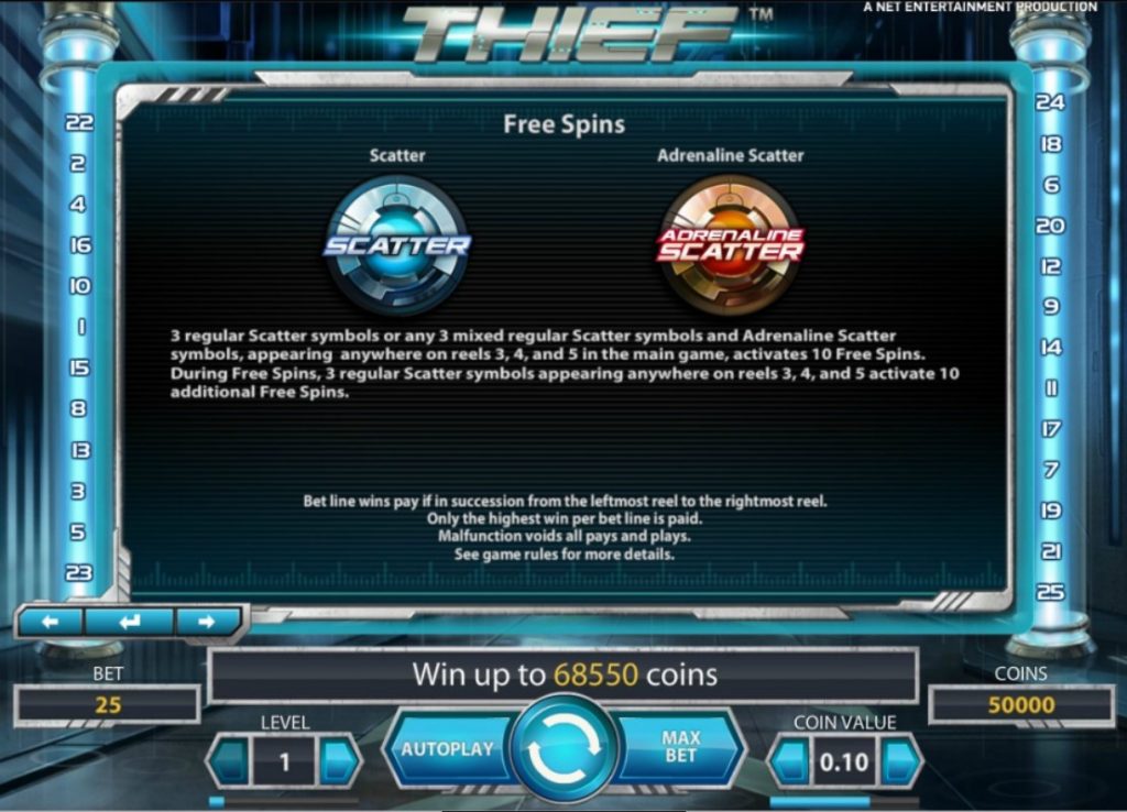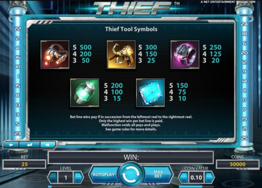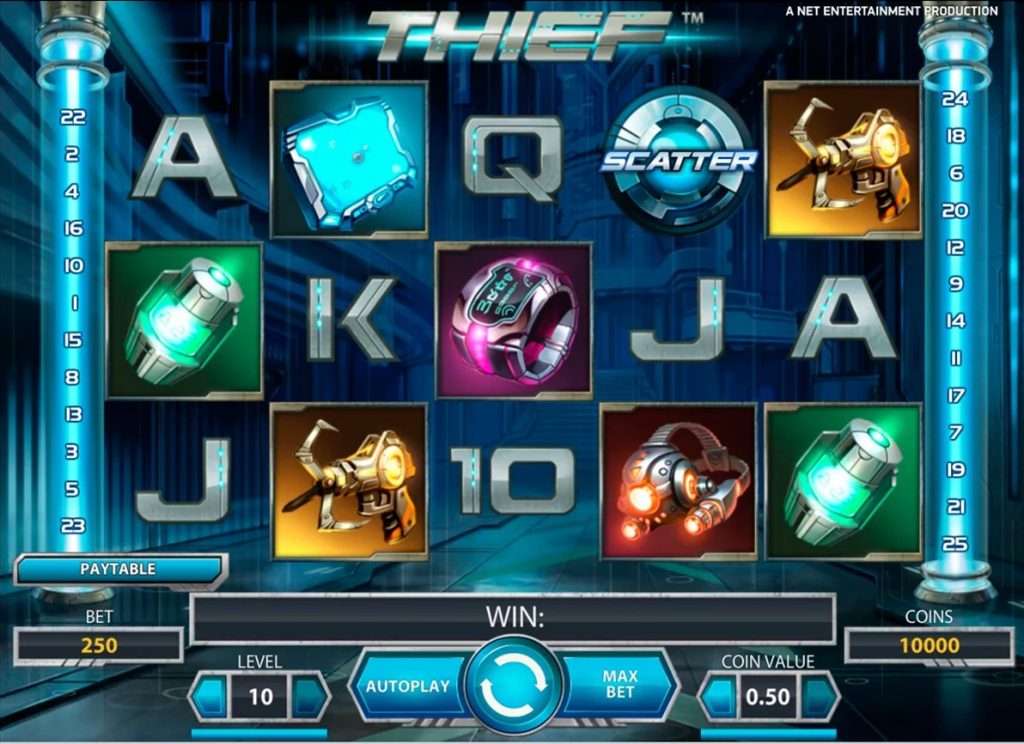 Игровой аппарат от Нетент Thief позволяет установить максимальную ставку – 125 монет. Процент выплат – достаточно высокий – 96,7%. Предельная выплата 5000:1. У слота нет накопительного джекпота, игры с равными шансами. Количество барабанов стандартное – пять. А вот линий 25 – они фиксированные, изменению не подлежат. Во время игры можно оперировать только уровнем ставок. Есть Скаттер и Дикий символ. Ставка на одну линию варьируется от 0,01 до 5 монет.