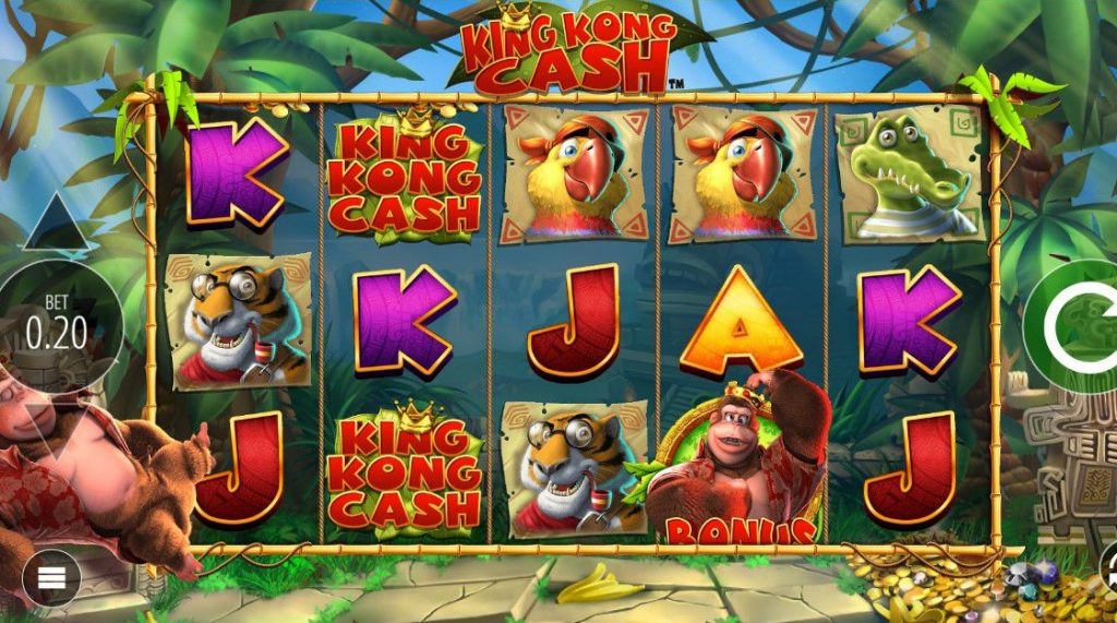 Чтобы вместе с большой обезьяной собирать выигрышные комбинации сразу по нескольким линиям, стоит посетить игровой аппарат King Kong Cash, разработанный компанией Blueprint Gaming. В игре предусмотрены разные бонусные опции, поэтому можно выиграть большие деньги (максимум 200 000 монет).