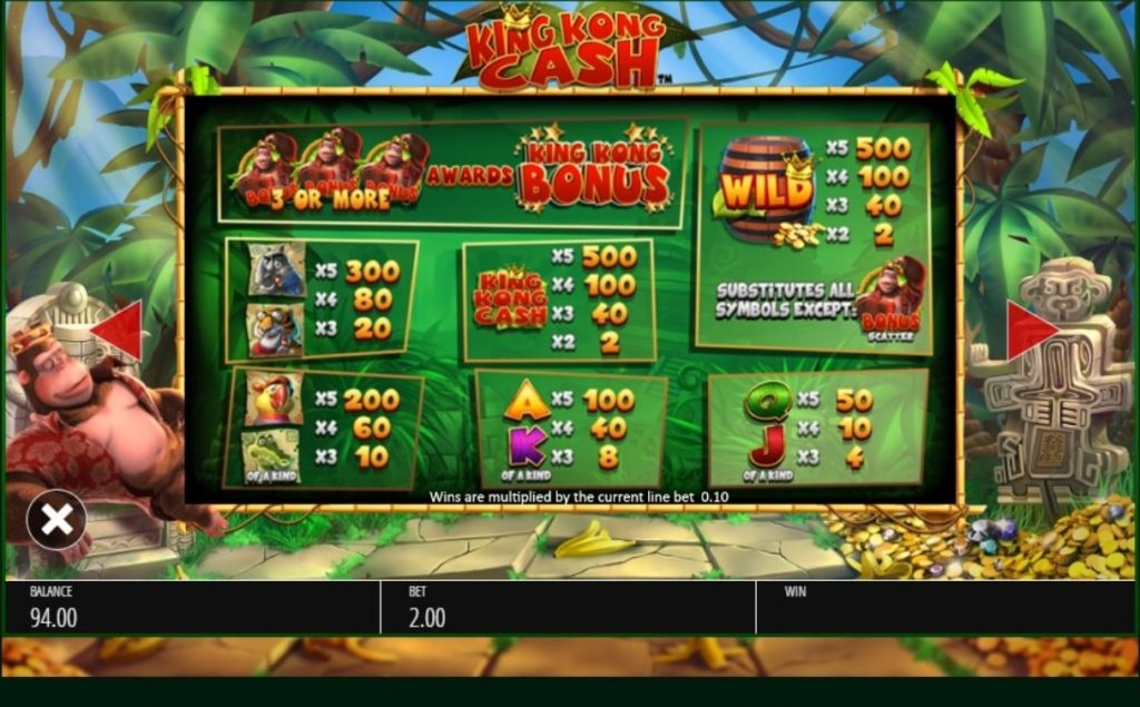 Игровой аппарат Кэш Кинг Конга – это традиционный симулятор с пятью катушками и 20 линиями для ставок. Менять количество игровых полос нельзя. Слот можно запускать в автоматическом режиме. В нем нет накопительного или прогрессивного джекпота.