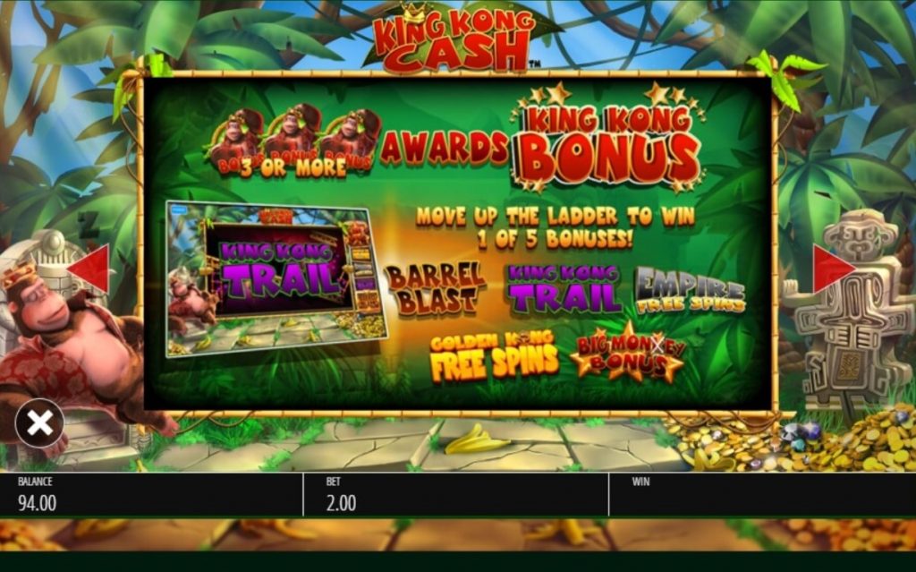 - King Kong Trail – это игра в стиле ретро, которая открывается на специальном экране. Здесь несколько этапов. Главное не попасть на бомбу и не подорваться. Золотая обезьяна выдает главный приз.