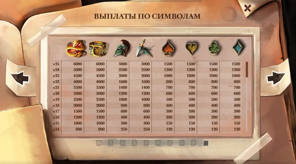 Все изображения слота Лост выполнены в стиле древних реликвий. Это игральные карты, кинжал, браслет, медальон в виде змеи, шлем. Одинаковые изображения появляются стеками, поэтому все 25 ячеек игрового поля могут занять однотипные символы.