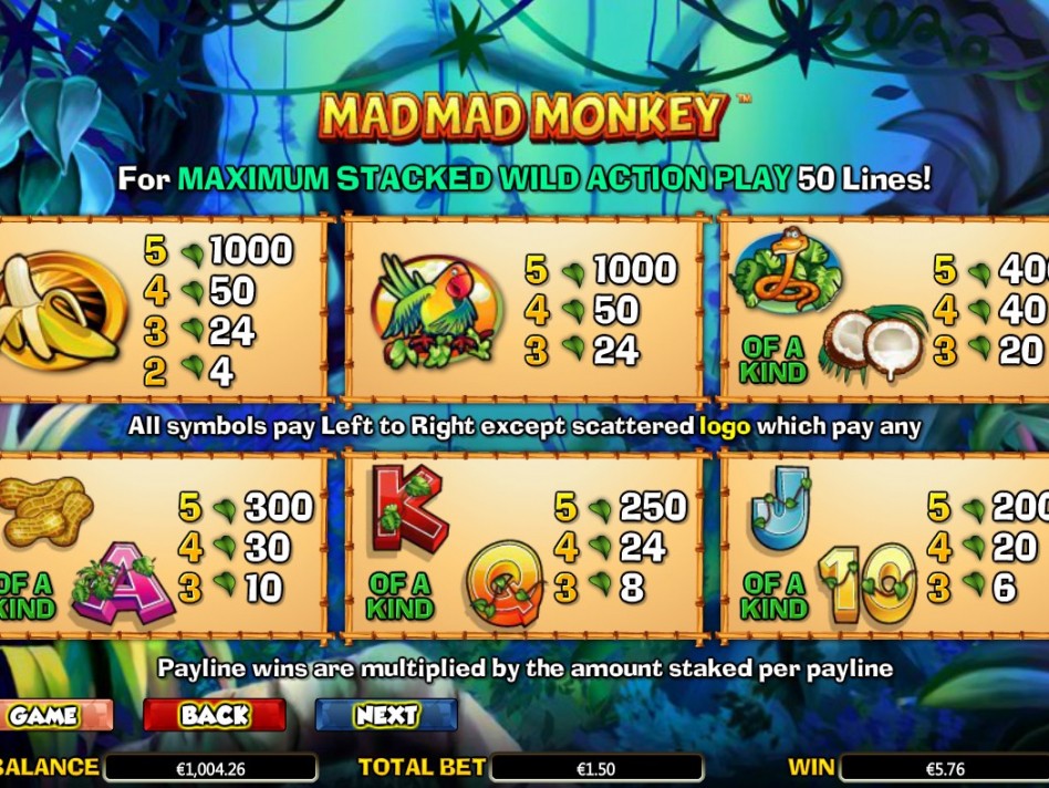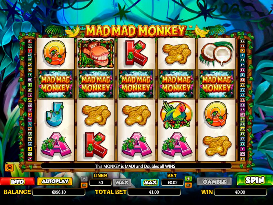 Видеослот Mad Mad Monkey является традиционным игровым автоматом с пятью барабанами. Общее количество игровых линий – 50. Игрок может активировать любое количество. В слоте Безумная обезьянка не предусмотрен накопительный джекпот, зато есть другие бонусы, которые преумножат выигрыш гемблера.