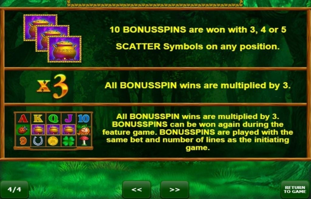 Функции скаттера в симуляторе Волшебный лес выполняет изображение лепрекона с горшком, наполненным золотом. Три и более скаттеров в любой части поля активируют бесплатные вращения. За символ-разброс на одной полосе при повторении от двух штук дадут 2-100 ставок.