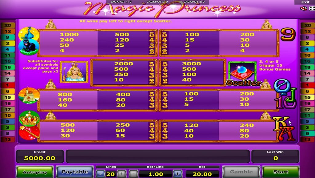 Игровой автомат Magic Princess – это классическая модель с пятью барабанами и двадцатью активными линиями. Хоть в игре нет накопительного джекпота, предусмотрены другие бонусы, которые приносят игроку значительные денежные вознаграждения.