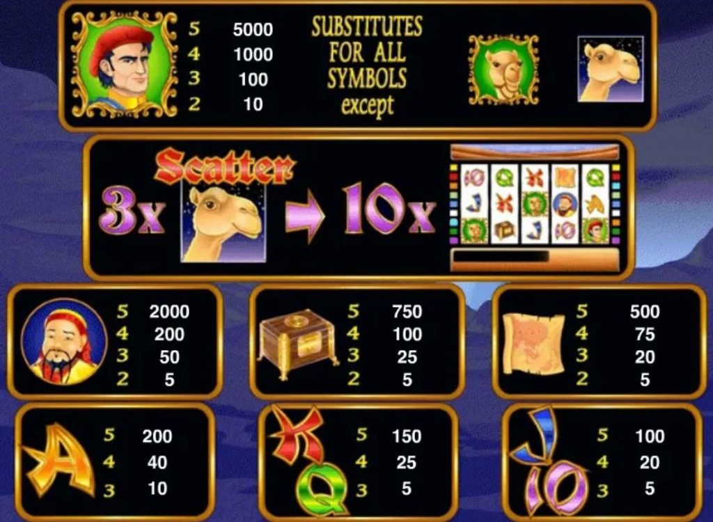 - Скаттер – верблюд на фоне звездного неба. Выпадают Скаттеры только на 1-3-5 барабанах. Если выпадает за один спин три картинки одновременно, начинается бонусная игра.