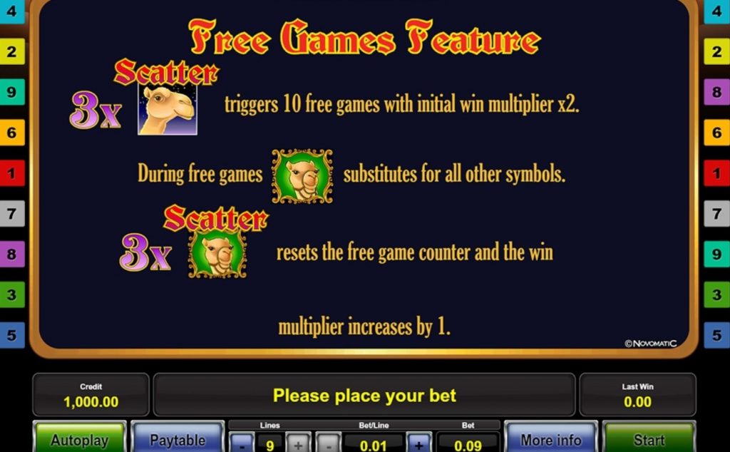 Если на 1-3-5 барабанах одновременно выпадает по 1 верблюду (в общем количестве 3), то запускается призовая игра. На время бесплатных вращений действует двойной множитель. Во время бесплатных спинов также могут выпадать верблюды на зеленом фоне. Они заменяют собой недостающие элементы в цепочке. Если же выпадает 3 верблюда, то дают еще 10 спинов. Ограничений по бесплатным вращениям нет. При этом во второй призовой игре действует уже тройной множитель.