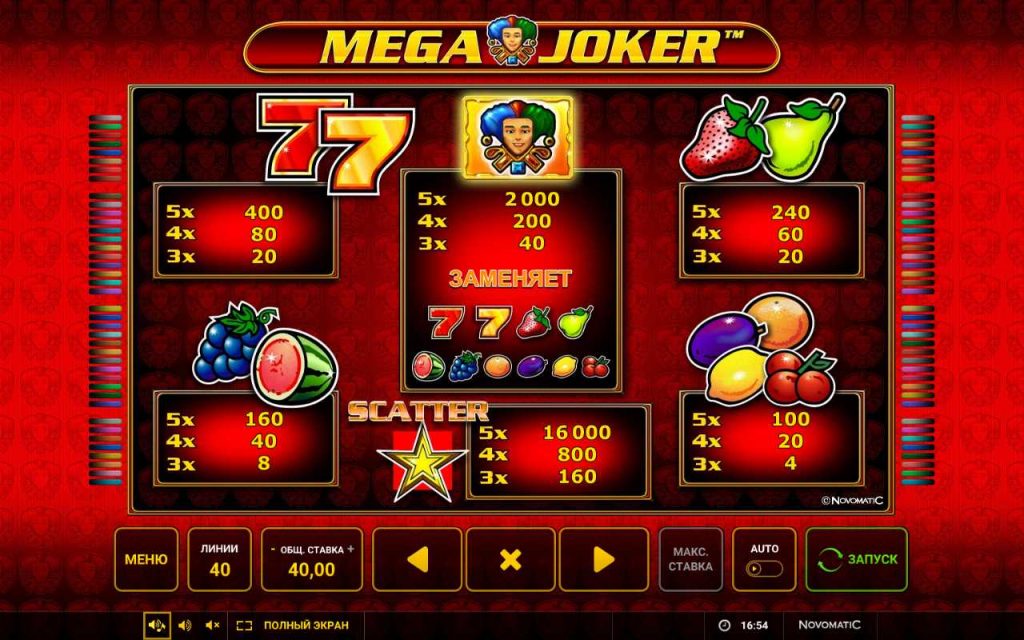 Симулятор Мега джокер – это игровой автомат типа видеослот, в котором предусмотрено пять катушек и 40 игровых полос. Гемблер может активировать любое количество линий для выплат от 1 до 40. Аппарат не рассчитан на накопительный или прогрессивный джекпот. При желании игрок может запускать его в автоматическом режиме.