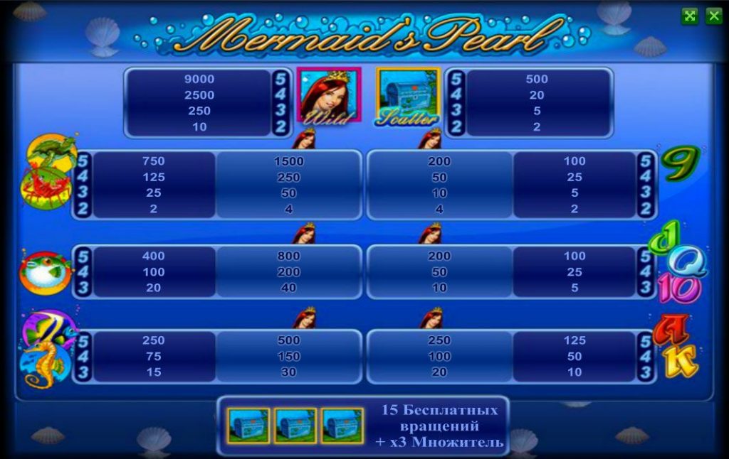 Игровой автомат Mermaids Pearl – это классический видеослот с пятью катушками и девятью полосами для выплат. Гемблер может активировать 1, 3, 5, 7 или 9 линий. В слоте не предусмотрен накопительный призовой фонд. Игроки могут запускать автомат в автоматическом режиме. Здесь нет игры на удвоение.