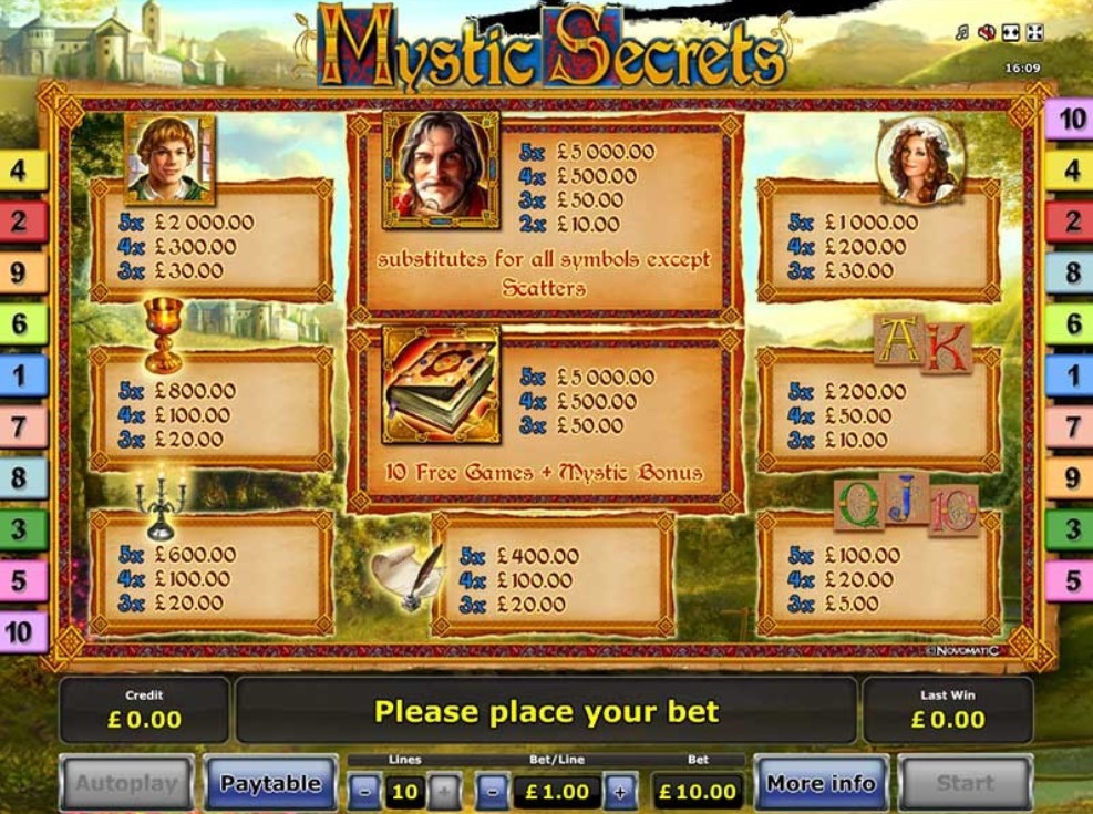 Автомат Mystic Secrets – это видеослот, в котором разработчиком предусмотрено пять катушек и 10 игровых полос. Поскольку линии нефиксированные, пользователь может активировать любое число линий от 1 до 10. Для удобства пользователей разработчик предусмотрел возможность запуска модели в режиме автоматических спинов, но перед этим нужно выбрать ставку и количество вращений. Симулятор не имеет накопительного или прогрессивного приза, поэтому сорвать большой куш нельзя.